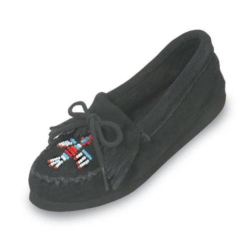 Soft, supple suede leather moccasin with colorful, beaded Indian Thunderbird design sewn across the toe accented by whip-stitching detail. This Minnetonka classic has a decorative layer of fringe topped off with a thin leather bow and wrap around laces for a custom fit. Slip-on ease with a fully padded insole for comfort and a crepe outer sole for durability. ...Read more |